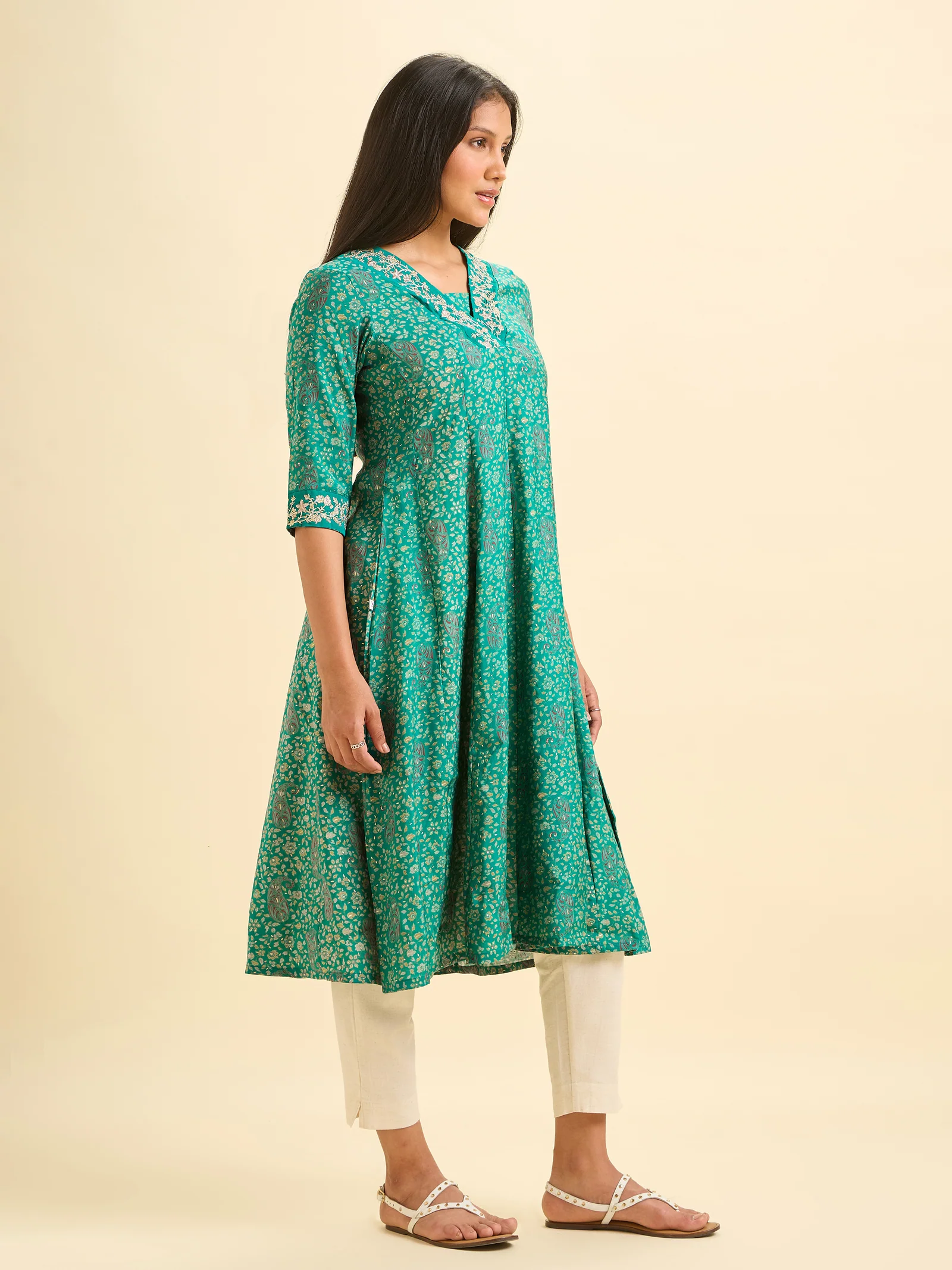Rama green modal chanderi kali cut printed kurti with embroidery